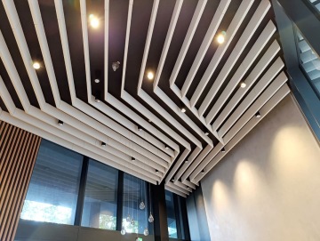 Pro tuto stavbu jsme formátovali pruhové akustické panely, které jsou uspořádané v zalomené struktuře pod stropy společných prostor bytového domu. Panely mají jak estetický, tak funkční charakter: vytvářejí designový podhled, poskytují prostor pro nenápadné umístění bodových svítidel, tlumí ozvěnu a dělají prostor "na poslech" útulnějším.