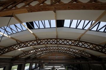 Velké množství skleněných ploch bylo nutno přirozeně propojit s další konstrukcí, k čemuž byly použity naše prefabrikované sádrokartonové díly. Výzvou byla mohutná oblouková stropní konstrukce v historické hale. Tento sádrokartonový strop drží pevně v dokonalém oblouku ohýbané CD profily z naší výroby.
